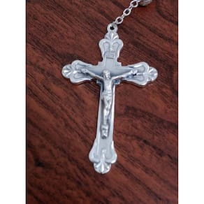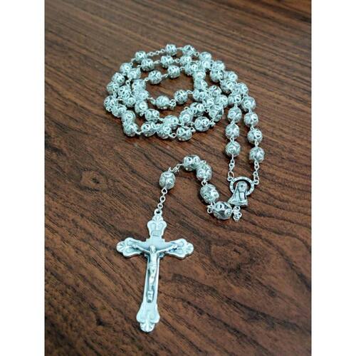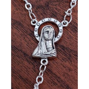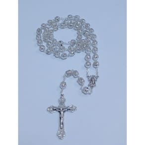 Este terço de tamanho maior tem contas de cristal transparentes de 9 mm e são tampadas de filigrana em tons de prata. A peça central apresenta a Nossa Senhora de um lado e o Sagrado Coração de Jesus no reverso. O crucifixo é oxidado de prata mede quase 6,2 cm. O rosário mede aproximadamente 65 centímetros do centro das contas até a ponta do crucifixo. Feito na Itália. Marca: San Gregorio - Artigos Religiosos
