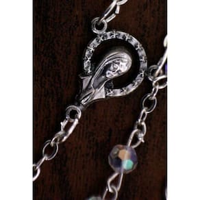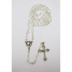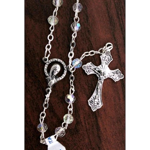Este lindo terço Italiano, apresenta contas de cristal econômico branco. No centro uma Medalha de Nossa Senhora na frente e o Sagrado Coração de Jesus no verso. O colar é folheado de prata oxidada, assim como o crucifixo lindamente detalhado. Mede aproximadamente 37 centímetros. Marca: San Gregorio - Artigos Religiosos