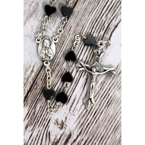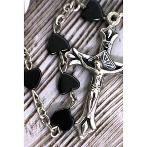 Este terço tem lindas contas de hematita em forma de coração cinza. A peça central apresenta Nossa Senhora do Monte Carmelo de um lado e o Sagrado Coração de Jesus no outro. É oxidado pela prata, assim como o crucifixo. Mede 42 cm do centro das contas até a ponta do crucifixo. Fabricado na Itália. Sagrado Coração de Jesus é uma devoção ao verdadeiro coração físico de Jesus como uma representação de seu amor divino pela humanidade. A devoção enfatiza o amor absoluto, a compaixão e a longanimidade do coração de Jesus pela humanidade. Marca: San Gregorio - Artigos Religiosos