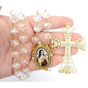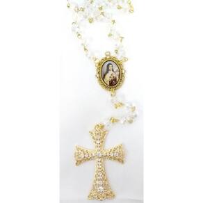 Terço de Noiva confeccionado manualmente com cristais boreais de vidro importados de 10mm. Cruz Banhada a Ouro cravejada com strass medindo 8,0 cm de altura e 5,5 cm de largura Entremeio Banhado a Ouro resinado de Santa Terezinha do Menino Jesus. Medida do entremeio: 30mm x 40mm / área da foto: 18mm x 25mm. O terço mede aproximadamente 75 cm, lindo e delicado. O terço é acomodado em uma fina caixa de veludo.