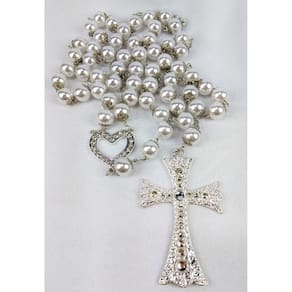 Terço de Noiva confeccionado com pérolas brancas ABS de 12mm, não descascam e não deformam. Cada pérola é apoiada por tulipas de 8mm e os Pai-Nossos revestidos com tulipas duplas. Cruz Banhada a prata cravejada com Strass Preciosa medindo 8,0 cm de altura e 5,0 cm de largura. Entremeio de Coração banhado a prata cravejado com Strass Preciosa medindo 3,5 cm de altura e 3,2 cm de largura. A medida do terço esticado é de aproximadamente 78 cm. O terço é acomodado em uma fina caixa de veludo. Marca: Não Informado