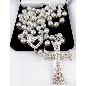 Terço De Noiva Banho De Prata Perolas Brancas Coração