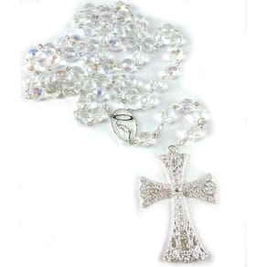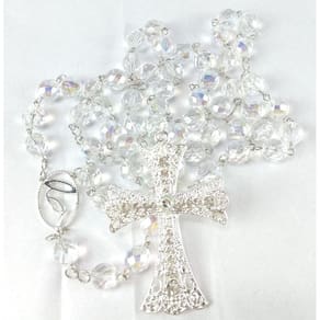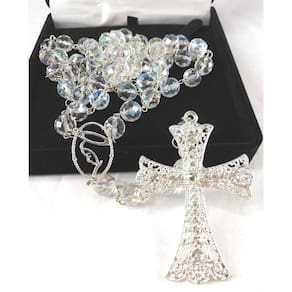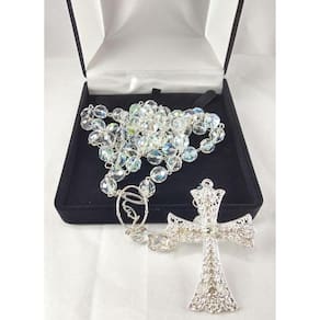 Terço De Noiva Cristal Boreal Banho De Prata 10MmQuando se fala em casamento o que vem à tona é a imagem de um evento cheio de Requinte e Sofisticação.O Terço de Noiva é um Acessório que trás muita Classe e Elegância para esse Momento tão Lindo e Marcante que é o Casamento, é um detalhe que sempre chama atenção nas noivas, seja por seu significado ou simplesmente por sua beleza.Terço de Noiva confeccionado manualmente com cristais boreal tchecos de 10mm. Cruz com Banho de Prata cravejada de Strass medindo 7,0 cm de altura e 4,7 cm de largura. Entremeio de Maria com Banho de Prata medindo 2,7 cm de altura e 1,6 cm de largura. Medida do terço esticado: 70 cm. O terço é acomodado em uma fina caixa de veludo. Marca: Evangelize