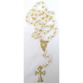 Terço de Noiva confeccionado manualmente com cristais boreais tchecos de 10mm, não descascam e não deformam. Cada cristal é apoiado por tulipas e os Pai-Nossos revestidos com tulipas duplas. Cruz Banhada a ouro cravejada de Strass medindo 5,0 cm de altura e 3,0 cm de largura. Entremeio de Nossa Senhora Aparecida com Strass. Medida do terço esticado: 60 cm aproximadamente. O terço é acomodado em uma fina caixa de veludo. Marca: Evangelize