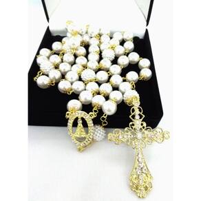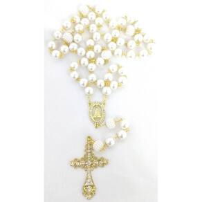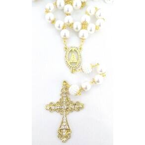 Terço de Noiva confeccionado manualmente com pérolas brancas ABS de 12mm, não descascam e não deformam. Cada pérola é apoiada por tulipas com banho dourado de 8mm e os PaiNossos são confeccionados com pérolas framboesas brancas de 14mm revestidas com tulipas duplas. Cruz com Banho Dourado cravejada com strass medindo 7,4 cm de altura e 4,6 cm de largura. Entremeio com Banho Dourado de Nossa Senhora Aparecida cravejado com strass. O terço mede aproximadamente 75 cm aproximadamente . O terço é acomodado em uma fina caixa de veludo. Marca: Evangelize