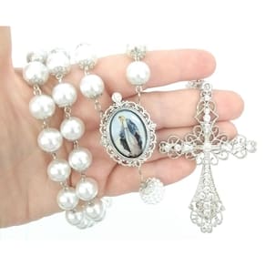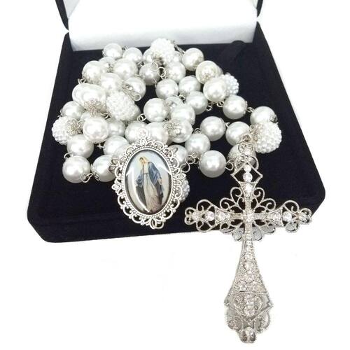 Terço de Noiva confeccionado manualmente com pérolas brancas ABS de 12mm, não descascam e não deformam. Cada pérola é apoiada por tulipas prata de 8mm e os PaiNossos são confeccionados com pérolas framboesas de 14mm revestidas com tulipas duplas. Cruz Prata cravejada com strass medindo 7,4 cm de altura e 4,6 cm de largura.Entremeio Prata resinado de Nossa Senhora das Graças. Medida do entremeio: 30mm x 40mm / área da foto: 18mm x 25mm.O terço mede aproximadamente 78 cm.O terço é acomodado em uma fina caixa de veludo. Marca: Evangelize