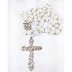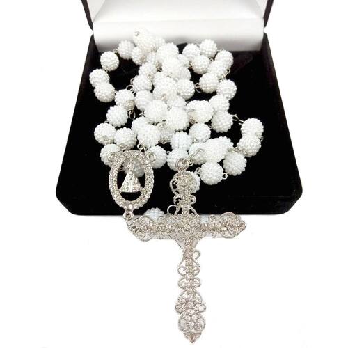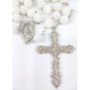 Terço de Noiva confeccionado com pérolas brancas framboesa ABS de 12mm, não descascam e não deformam. Cruz Prata cravejada com Strass Preciosa medindo 8,0 cm de altura e 5,5 cm de largura. Entremeio de Nossa Senhora Aparecida cravejada com Strass Preciosa medindo 3,5 cm de altura e 2,3 cm de largura. A medida do terço esticado é de aproximadamente 73 cm. O terço é acomodado em uma fina caixa de veludo. Marca: Não Informado
