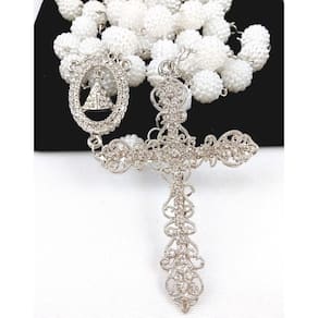 Terço de Noiva confeccionado com pérolas brancas framboesa ABS de 12mm, não descascam e não deformam. Cruz Prata cravejada com Strass Preciosa medindo 8,0 cm de altura e 5,5 cm de largura. Entremeio de Nossa Senhora Aparecida cravejada com Strass Preciosa medindo 3,5 cm de altura e 2,3 cm de largura. A medida do terço esticado é de aproximadamente 73 cm. O terço é acomodado em uma fina caixa de veludo. Marca: Não Informado