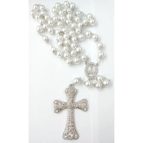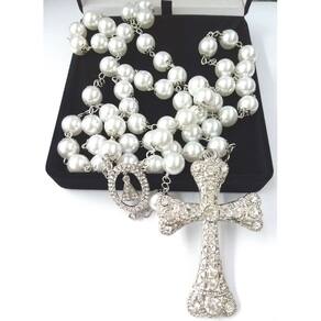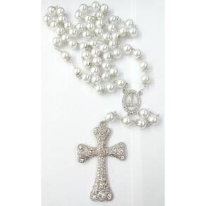 Terço de Noiva confeccionado com pérolas brancas ABS de 12mm, não descascam e não deformam. Cada pérola é apoiada por tulipas de 8mm e os Pai-Nossos revestidos com tulipas duplas. Cruz prata cravejada com Strass Preciosa medindo 8,5 cm de altura e 5,5 cm de largura. Entremeio de Nossa Senhora Aparecida cravejada com Strass Preciosa medindo 3,5 cm de altura e 2,3 cm de largura. A medida do terço esticado é de aproximadamente 78 cm. O terço é acomodado em uma fina caixa de veludo. Marca: Evangelize Ean: 0606529006396