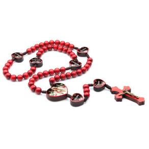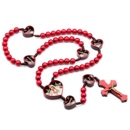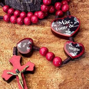 Este Terço é produzido com contas de madeira de 8 mm em cordão encerado, o crucifixo é de madeira com o Cristo em metal dourado, o entremeio e as medalhas do Pai Nosso, em formato de coração são resinadas e contém lindas imagens tornando este terço especial.