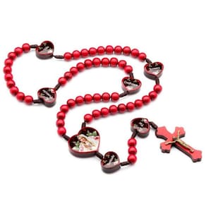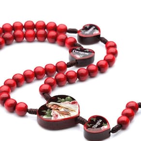 Este Terço é produzido com contas de madeira de 8 mm em cordão encerado, o crucifixo é de madeira com o Cristo em metal dourado, o entremeio e as medalhas do Pai Nosso, em formato de coração são resinadas e contém lindas imagens tornando este terço especial.