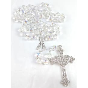 Terço de Noiva confeccionado com cristais boreal tchecos preciosa de 12mm. Cruz Coração com Banho de Prata cravejada de Strass Preciosa medindo 8,0 cm de altura e 5,0 cm de largura. Entremeio de Nossa Senhora Aparecida vazado medindo 3,65 cm de altura e 2,5 de largura. A medida do terço esticado é de aproximadamente 80 cm. O terço é acomodado em uma fina caixa de veludo. Marca: Evangelize Ean: 0606529006419