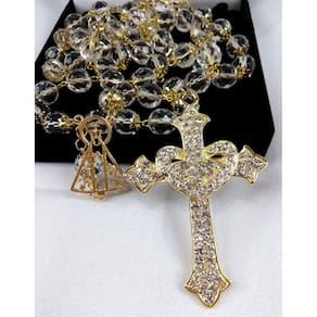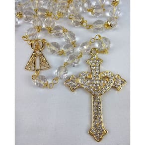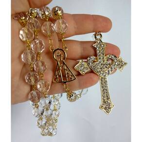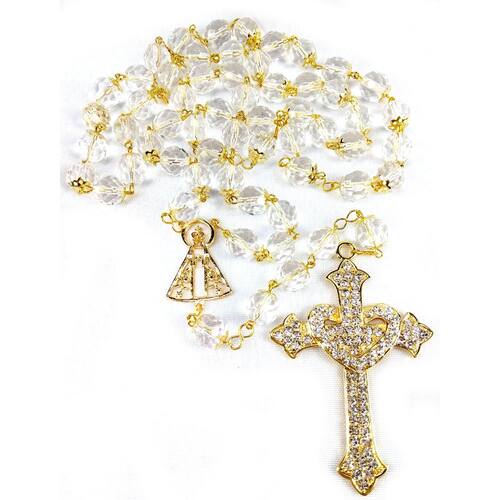 Terço de Noiva confeccionado manualmente com cristais tchecos transparentes de 12mm. Cada cristal é apoiado por tulipa dourada e os Pai-Nossos revestidos com tulipas duplas. Cruz Coração Dourada cravejada de Strass medindo 8,0 cm de altura e 5,0 cm de largura. Entremeio Vazado de Nossa Senhora Aparecida.
