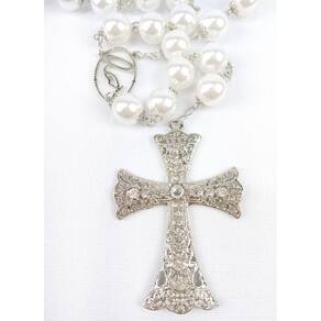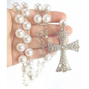Terço de Noiva confeccionado com pérolas brancas ABS de 12mm, não descascam e não deformam. Cada pérola é apoiada por tulipas prata de 6mm e os Pai-Nossos revestidos com tulipas duplas. Cruz prata cravejada de Strass medindo 7,0 cm de altura e 4,7 cm de largura. Entremeio de Maria medindo 2,7 cm de altura e 1,6 cm de largura. A medida do terço esticado é de aproximadamente 73 cm. O terço é acomodado em uma fina caixa de veludo. Marca: Não Informado Ean: 0606529006389