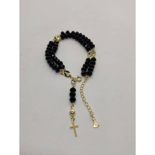 Terço Pulseira Preto e Dourado - 23 cm, Contas em Plástico, Medalhas em Zamac, Fio de Nylon, Bolas em Acrílico, Feito em Corrente, Cruz e Entremeio em Zamac com Banho Dourado, Acompanha Embalagem