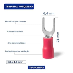 Uma peça essencial para sua instalação, os terminais de conexão forquilha Tramontina em cobre estanhado e nylon 1,5 mm x 6,4 mm x m4 vermelho 100 peças garantem conexões seguras e eficientes para seus projetos elétricos. Fabricados com cobre estanhado de alta condutividade e revestidos em nylon, oferecem resistência e durabilidade. Pacote com 100 peças.