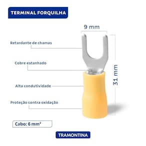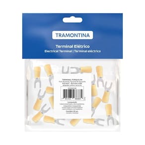 Desenvolvido para suportar diversas aplicações, os terminais de conexão forquilha Tramontina em cobre estanhado e nylon 6 mm x 9 mm x m5 amarelo 25 peças garantem conexões seguras e eficientes para seus projetos elétricos. Fabricados com cobre estanhado de alta condutividade e revestidos em nylon, oferecem resistência e durabilidade. Pacote com 25 peças.