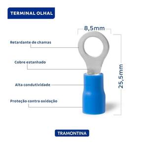 Com alta condutividade e resistência, os terminais de conexão olhal Tramontina em cobre estanhado e nylon 2,5 mm x 8,5 mm x m5 azul 50 peças garantem conexões seguras e eficientes para seus projetos elétricos. Fabricados com cobre estanhado de alta condutividade e revestidos em nylon, oferecem resistência e durabilidade. Pacote com 50 peças.
