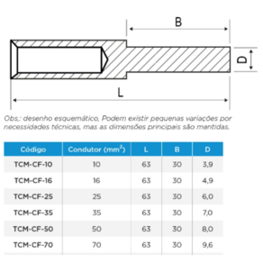 Os Terminais de Compressão Maciço Pino Curto TCM têm seção transversal maciça, como se fossem cabos rígidos de cobre, além de serem chanfrados, melhorando a conexão com equipamentos.
