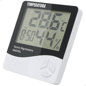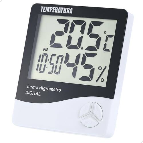 Termo - higrômetro digital com registro de máxima e mínima Funções termômetro, higrômetro e relógio Indica temperatura e umidade do ambiente Com suporte para colocar em mesa e furação para pendurar parafuso não incluso Alimentação: 1 pilha aaa inclusa Indicação em ºc ou ºf Escala de -50ºc a 50ºc / -58ºf a 158ºf / 10% a 99%rh 12h/24h com alarme Precisão: 1ºc / 5%rh Tamanho: 9,5 largura x 11cm altura x 2,5cm profundidade