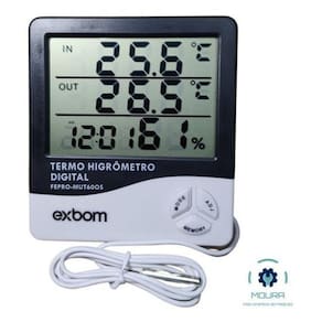Termo Higrômetro Digital Com Sensor Externo Calibrado Calibração em 3 pontos de temperatura interna e externa, e 3 pontos de umidade. ATENÇÃO, após concluir a compra, enviar o E-MAIL por mensagem para a emissão e envio do certificado de calibração. Especificações: ---------------------- Escala de medição interna: -10ºC até 50ºC -14ºF até 122ºF Escala de medição externa: -50 a 70C -58ºF até 158ºF Precisão de medida: +- 1ºC 1,8ºF Resolução de temperatura: +- 0,1ºC 0,2ºF Faixa de medição de umidade: 20% até 99% RH Precisão de umidade: +- 5% RH Resolução de umidade: 1% Unidade de temperatura em ºC e ºF Memória de temperatura máxima, mínima e umidade Relógio, despertador e data Aviso de horas Alimentação: 1 Pliha AAA 1,5v inclusa Dimensões aproximadas do produto: 98 x 106 x 23 mm LxAxP Comprimento do sensor: 1,5 m Itens inclusos: -------------------- 01 Termo-higrômetro digital com sensor externo 01 Pliha AAA 1,5v 01 Certificado de Calibração Rastreável RBC/Inmetro Enviado Digitalmente