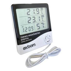 Escala de medição interna: -10ºC até 50ºC -14ºF até 122ºF Escala de medição externa: -50 a 70C -58ºF até 158ºF Precisão de medida: +- 1ºC 1,8ºF Resolução de temperatura: +- 0,1ºC 0,2ºF Faixa de medição de umidade: 20% até 99% RH Precisão de umidade: +- 5% RH Resolução de umidade: 1% Unidade de temperatura em ºC e ºF Memória de temperatura máxima, mínima e umidade Relógio, despertador e data Aviso de horas Alimentação: 1 Pliha AAA 1,5v inclusa Dimensões aproximadas do produto: 98 x 106 x 23 mm LxAxP Comprimento do sensor: 1,5 m