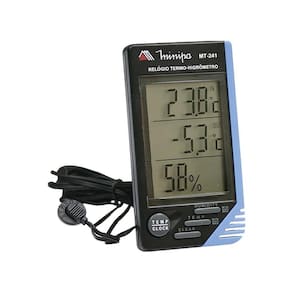 Equipamento voltado para o monitoramento de temperatura e umidade ambiente. Possui sensor interno e externo, relógio integrado, leitura máxima e mínima com precisão básica para temperatura de ± 2°C e umidade de ± 10%.