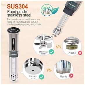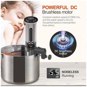 Design de aço inoxidável a hélice e toda a parte da água em toda a lâmina de aço inoxidável sus304, forte e durável, para evitar o uso de qualquer concha de fundo de plástico ou hélice por um longo tempo para aquecer e produzir substâncias nocivas Design ultrassilencioso a roda de ondas usa design espiral de ângulo de 45 graus inclinado de dupla face de aço inoxidável com design de entrada de água em forma de diamante de manga de aço inoxidável, para evitar a propagação do som ao máximo Motor DC sem escova G300 , G310 usa a mesma qualidade do motor DC sem escova de drones high end, rotação uniforme de 2900r , m, superpotência, mais durável Sistema de controle termostático usando chip de controle de alta precisão e poderoso motor DC sem escova para aumentar a taxa de fluxo de água, monitoramento contínuo da temperatura e controle da estabilidade da temperatura para garantir que a temperatura de todas as partes dos ingredientes permaneça a mesma Faixa de temperatura 104 F 194 F 40 C 90 C Fácil de limpar e à prova dágua foi certificado como impermeável IPX7 e pode ser limpo colocando todo o corpo na água, permitindo uma limpeza profunda de cada fenda de manchas de óleo. Vida saudável Você pode usar o fogão sous vide G300 , G310 para ovos de spa, bife, costeletas de cordeiro, lagosta, bacon, sem cozinhar demais, retendo mais nutrientes e vitaminas para que você possa desfrutar do sabor perfeito do chef de alta classe Michelin sempre Super fluxo de água O sous vide adota design de fluxo de água de 16L , min, o que aumenta a velocidade de circulação interna da água e garante a estabilidade da temperatura em cada local. Assim, você pode colocar mais ingredientes na mesma panela ao mesmo tempo e não precisa se preocupar com o aquecimento desigual dos alimentos Marca: Não Informado