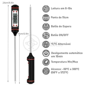 Termômetro digital para alimentos com desligamento automático. Mede a temperatura de alimento em graus célsius e fahrenheit com extrema precisão e rapidez. Perfeito para medir a temperatura de prato em banho maria no forno e outros. Seu display em LCD facilita a visualização das informações de modo claro e nítido junto de seu material de alta durabilidade e resistência que garante uma vida útil muito mais longa e durável para o produto.