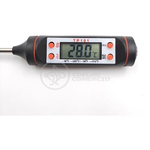 Termômetro digital para alimentos com desligamento automático. Mede a temperatura de alimento em graus célsius e fahrenheit com extrema precisão e rapidez. Perfeito para medir a temperatura de prato em banho maria no forno e outros. Seu display em LCD facilita a visualização das informações de modo claro e nítido junto de seu material de alta durabilidade e resistência que garante uma vida útil muito mais longa e durável para o produto.Mede de -50C a +300C