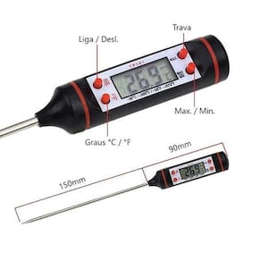 Mede a temperatura de alimento em graus célsius e fahrenheit com extrema precisão e rapidez. Perfeito para medir a temperatura de prato em banho maria no forno e outros. Seu display em LCD facilita a visualização das informações de modo claro e nítido junto de seu material de alta durabilidade e resistência que garante uma vida útil muito mais longa e durável para o produto.
