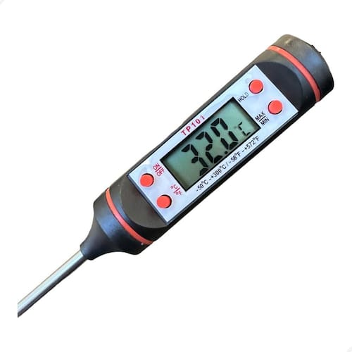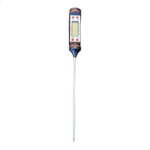 Termômetro digital com espeto para medição de temperatura em alimentos. Faixa de medição de -50ºC a +300ºC. Resolução de 0,1 ºC. Bateria 1,5V AG13 inclusa. Desligamento automático após 10 minutos sem uso. Possui botões para ligar/desligar, alternar entre Celsius e Fahrenheit, e função Hold para fixar a última medição. Memória da última medição. Mostra a maior e a menor temperatura medida (Max/Min).Tipo