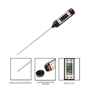 ESPECIFICAÇÕES: - Material: Aço inox e plástico - Medição: -50 a 300C - Taxa de erro: 1C - Voltagem: 1.5v