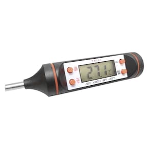 Este termômetro é tipo espeto e conta com uma ponta de prova ou haste em aço inox com terminal pontiagudo de 14,5 cm que serve tanto para alcançar o fundo de recipientes quanto para perfurar objetos sólidos, efetuando assim a medição.