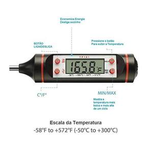 Termômetro digital para alimentos com desligamento automático. Mede a temperatura de alimento em graus célsius e fahrenheit com extrema precisão e rapidez. Perfeito para medir a temperatura de prato em banho maria no forno e outros. Seu display em LCD facilita a visualização das informações de modo claro e nítido junto de seu material de alta durabilidade e resistência que garante uma vida útil muito mais longa e durável para o produto.