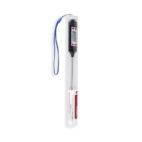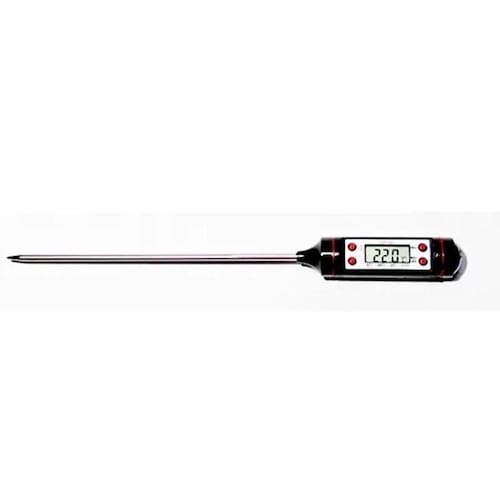 Especificações: Termômetro Culinário Digital Espeto Alimentos Cozinha - Mede de -50C a +300C- Escala: 0,1 C- Bateria 1,5V AG13 (Inclusa)- Tamanho: 23cm- Modo de economia de energia: desliga automaticamente após 10 minutos sem uso. principais botões:- Ligar/desligar, centígrados/Fahrenheit e Função Hold (Fixa última medição)- Memória da última medição- Desligamento automático para economia de energia Instruções 1- Pressione o Botão Hold para fixar a temperatura quando estiver medindo e pressione novamente para iniciar uma nova medição.2 - Pressione C e F para selecionar a escala que deseja utilizar.3 - On/Off - Liga e desliga o aparelho4 - Max/Min. Mostra a maior e a menor temperatura medida.