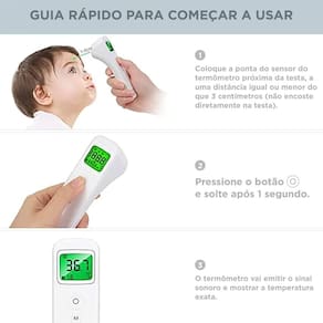 DIFERENCIAIS DO PRODUTO: - Utilização na testa - Medição a distância com precisão clínica (1-5 cm) - Visor com indicação de febre - Memória das 32 últimas memórias - Indicação do nível de bateria - Desligamento automático - Manual explicativo - Mede temperatura de objetos - Leitura da temperatura em poucos segundos - Entrega uma precisão de +/- 0.2ºC - Aprovado pela ANVISA (10410139003) e INMETRO.