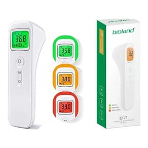 - Marca: Bioland - Modelo: E127 - Unidade de Medida: °C e F - Termômetro de testa - Luz de fundo de três cores (Alarme de cor): Verde para normal, Amarelo para febre leve e Vermelho para febre alta. - Tempo de medição: 1 seg. - Visor de LCD grande e legível - Indicação de som e cor para alta temperatura - Memória de 32 últimas medições - Função de varredura - para medições da temperatura superficial do leite fervido, água do banho, etc. - Desligamento automático: Após 1min sem uso - Energia Necessária: 2 pilhas alcalinas AAA 1,5V (Não inclusas) - Cor Disponível: Branco