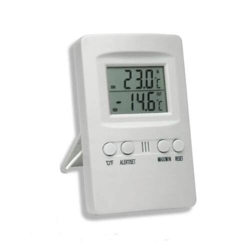 Termômetro Digital Máxima e Mínima - Supermedy O Termômetro Max & Min Digital da Supermedy possui um design ultra moderno é fabricado em plástico ABS, possui sensor com ponteira plástica em cabo extensor e displays de LCD. Permite a visualização das duas temperaturas de maneira simultânea com alta precisão para medir a temperatura -50º.C a +70º.C . Em adição a isso você poderá colocar uma temperatura externa de limite máxima e mínima para alerta de alarme sonoro mantendo assim uma determinada faixa de temperatura. As aplicações deste equipamento são amplas, sendo mais comumente Utilizado em: Transporte de Vacinas, Laboratório, Estufa, Balcão Frigorífico e Refrigeração em geral. Tem sido também Utilizado em Aquário, Agropecuária Avicultura, Suinocultura , criatórios em geral dentre outros. Características: - Medição rápida da temperatura; - Visor de cristais líquidos LCD de 3 dígitos de fácil leitura em dois mostradores; - Alarme Sonoro de 1 em 1 minuto ; - Cabo extensor 1,80 m; - Alta precisão de medição; - Intervalo de medição: escala -50º.C a +70º.C; - Escala Interna: -20+70°C; - Escala Externa: -50+70°C; - Resolução: 1°C / 1°F; - Precisão: ±1°C / ±1°F; - Alimentação: 01 Pilha AAA não inclusa ; - Medidas aproximadas AxLxP : 110x70x20mm; - Peso aproximado do produto: Aproximadamente 50 gramas, com pilha; - : 06 meses. Imagem meramente ilustrativa. Comercializado por: SKILL-TEC comércio e manutenção de instrumentos de Medição Ltda Ean: 7898944749061