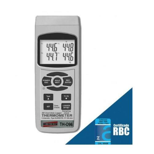 TERMÔMETRO DIGITAL PORTÁTIL TIPO K E J C/ SAÍDA RS-232 E DATALOGGER MOD TH-096 COM CERTIFICADO DE CALIBRAÇÃO ACREDITADA RBC DESCRIÇÃO: Termômetro digital portátil tipo k e j c/ saída rs-232 e datalogger mod th-096 incluso certificado de calibração acreditada rbc DESCRIÇÃO CERTIFICADO DE CALIBRAÇÃO: Certificado de Calibração RBC P/ Termômetro 4 Canais C/ Sensor Termopar e Outros Sensores Sob Procedimento PCI-081 Faixa de -25 a 400C Em 3 Pontos Distribuídos Conforme Escopo Calibração acreditada RBC Procedência: Laboratório de Calibração Instrutherm ESPECIFICAÇÕES TÉCNICAS: Display de Cristal Líquido (LCD) de 5 dígitos Escala do Sensor Tipo K: 1000 a 1300°C a resolução é de 1°C e a precisão ± (0.4 % +1°C) 50.1 a -100.0 ? a resolução é de 0,1°C e a precisão ± (0.4 % + 0.5 °C) 50.0 a 999.9 ? a resolução é de 0,1°C e a Precisão ± (0.4 % + 0.5 °C) 58.1 a -148.0 ? a resolução é de 1 °F e a precisão ± (0.4 % + 1.8 °F) 58.0 a 999.9 ? a resolução é de 1 °F e a precisão ± (0.4 % + 1 °F) 1000 a 2372 ? a resolução é de 1 °F e a precisão ± (0.4 % + 2 °F) Escala do sensor Tipo J: 50.1 a -100.0 ? a resolução é de 1°C e a precisão ± (0.4 % +1°C) 50.0 a 999.9 ? a resolução é de 1°C e a precisão ± (0.4 % + 0.5 °C) 1000 a 1150 ? a resolução é de 1°C e a precisão ± (0.4 % + 1 °C) 58.1 a -148.0 ? a resolução é de1°F e a precisão ± (0.4 % + 1.8 °F) 1000 a 2102 ? a resolução é de1°F e a precisão ± (0.4 % + 2 °F) Tipo de sensor: Sensor Termopar Tipo K ou J ou Pt-100 Canais de entrada: 4 canais, T1, T2, T3 e T4 Tempo de resposta: Aprox. 1 segundo Interface Serial: RS-232 Data logger com capacidade de armazenar até 16000 dados Data Hold: Congela a leitura no display Memória: Máxima e Mínima Desligamento automático ou manual Temperatura de operação: 0 a 50ºC Umidade de operação: Menor que 85% R.H Alimentação: 6 pilhas de 1,5V "AAA" ou adaptador de 9V Dimensões: 174 x 68 x 42mm Peso: 278g (apenas o equipamento). Nota: Para alimentar o instrumento, utilizar pilhas ou adaptador, nunca utilizar os dois juntos. ACESSÓRIOS FORNECIDOS: Manual de instruções Certificado de calibração acreditada rbc