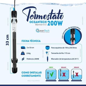 Termostato com aquecedor OceanTech 200W com marcação de temperatura lago ou aquário de até 250L - acompanha termômetro adesivo Para manter a temperatura estável e o bem-estar dos seus peixes, conte com o melhor equipamento do mercado, os termostatos com aquecedor OceanTech para aquários, são fabricados com materiais de alta qualidade, sua resistência é feita de puro níquel-cromo, que além de não enferrujar, possibilita rápida transferência de calor. Características: Resistência de puro níquel-cromo - não enferruja Tubo de quartzo de alta performance Painel de ajuste de temperatura Botão de controle de temperatura giratório Protetor plástico para a ponta Rápida transferência de calor Operação constante Totalmente submerso e à prova dágua Fácil instalação e manutenção Possui LED que indica quando o aquecedor está ligado Server para aquários de água doce ou marinhos Aquecedor e Termostato automático liga e desliga para atingir a temperatura regulada Compre nesse anúncio diretamente com um revendedor oficial OceanTech. Especificações técnicas: Marca: OceanTech Modelo: Warmer X-5 Potência: 200W Voltagem: escola a voltagem na lateral do anúncio Ajuste de temperatura entre 20ºC a 34ºC Peso: 230g Tamanho: 2 x 33 cm larg x alt Tamanho do fio: 115cm Para aquários de 150 a 250 litros Conteúdo da embalagem 1 termostato com aquecedor 1 protetor de plástico de ponta 2 ventosas para fixação 1 termômetro externo adesivo Nota: Nunca ligue esse equipamento fora da água Se notar qualquer dano no cabo de energia, não utilizar o produto, pois haverá risco de choque elétrico. : 1 ano pelo fabricante, 3 meses pelo revendedor. apenas para defeito de fabricação. Dicas de uso: Use o termostato na vertical Instale-o em local onde há circulação de água Mantenha-o totalmente submerso Antes de ligar o equipamento, verifique a temperatura ideal para a espécie mantida no seu aquário Regular a temperatura desejada por meio do botão giratório. Como instalar o termostato Oceantech Limpe a parte de dentro do aquário onde será fixado o termostato Coloque na posição vertical e fixe com as ventosas no vidro Deixe-o aclimatando por cerca de 15min evitando choque térmico Ligue-o na tomada certifique-se que a voltagem do produto é a mesma da rede . Funcionamento: Sempre que o sensor do equipamento detectar na água uma temperatura abaixo do ajustado no painel, o aquecedor ligará automaticamente, e desligará quanto atingir a temperatura desejada. Manutenção: Realize a limpeza do termostato a cada 30 dias Sempre desligue o equipamento de 15 a 20 minutos antes de retirá-lo do aquário Lave-o em água corrente e não utilize produtos abrasivos. Serve para piscina Não serve. Serve para chocadeira Não serve. Serve para aqua-terrário Não serve. Posso colocar na horizontal O fabricante aconselha apenas uso na vertical. Obrigado pela visita e boas compras ATENÇÃO Nossas imagens e textos são registrados e com direito de uso autoral controlado e reservado a essa loja e as lojas parceiras devidamente autorizadas em contrato.