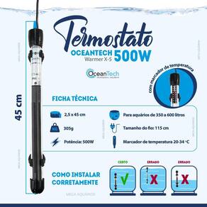 Termostato com aquecedor OceanTech 500W com marcação de temperatura lago ou aquário de até 600L - acompanha termômetro adesivo Para manter a temperatura estável e o bem-estar dos seus peixes, conte com o melhor equipamento do mercado, os termostatos com aquecedor OceanTech para aquários, são fabricados com materiais de alta qualidade, sua resistência é feita de puro níquel-cromo, que além de não enferrujar, possibilita rápida transferência de calor. Características: Resistência de puro níquel-cromo - não enferruja Tubo de quartzo de alta performance Painel de ajuste de temperatura Botão de controle de temperatura giratório Protetor plástico para a ponta Rápida transferência de calor Operação constante Totalmente submerso e à prova dágua Fácil instalação e manutenção Possui LED que indica quando o aquecedor está ligado Server para aquários de água doce ou marinhos Compre nesse anúncio diretamente com um revendedor oficial OceanTech. Especificações técnicas: Marca: OceanTech Modelo: Warmer X-5 Potência: 500W Ajuste de temperatura entre 20ºC a 34ºC Peso: 305g Tamanho: 2,5 x 45 cm larg x alt Tamanho do fio: 115cm Para aquários de 350 a 600 litros Conteúdo da embalagem 1 termostato com aquecedor 1 protetor de plástico de ponta 2 ventosas para fixação 1 termômetro externo adesivo Nota: Nunca ligue esse equipamento fora da água Se notar qualquer dano no cabo de energia, não utilizar o produto, pois haverá risco de choque elétrico. : 1 ano pelo fabricante, 3 meses pelo revendedor. apenas para defeito de fabricação. Dicas de uso: Use o termostato na vertical Instale-o em local onde há circulação de água Mantenha-o totalmente submerso Antes de ligar o equipamento, verifique a temperatura ideal para a espécie mantida no seu aquário Regular a temperatura desejada por meio do botão giratório. Como instalar o termostato Oceantech Limpe a parte de dentro do aquário onde será fixado o termostato Coloque na posição vertical e fixe com as ventosas no vidro Deixe-o aclimatando por cerca de 15min evitando choque térmico Ligue-o na tomada certifique-se que a voltagem do produto é a mesma da rede . Funcionamento: Sempre que o sensor do equipamento detectar na água uma temperatura abaixo do ajustado no painel, o aquecedor ligará automaticamente, e desligará quanto atingir a temperatura desejada. Manutenção: Realize a limpeza do termostato a cada 30 dias Sempre desligue o equipamento de 15 a 20 minutos antes de retirá-lo do aquário Lave-o em água corrente e não utilize produtos abrasivos. Serve para piscina Não serve. Serve para chocadeira Não serve. Serve para aqua-terrário Não serve. Posso colocar na horizontal O fabricante aconselha apenas uso na vertical. Obrigado pela visita e boas compras ATENÇÃO Nossas imagens e textos são registrados e com direito de uso autoral controlado e reservado a essa loja e as lojas parceiras devidamente autorizadas em contrato. Marca: Não Informado