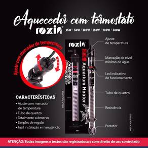 Especificações técnicas: Marca: Roxin Modelo: HT-1300/Q3 100W Produto: Termostato com aquecedor Potência: 100W Ajuste de temperatura entre 22ºC a 34ºC Grau de resistência IP68 Protegido contra a imersão contínua em água até 1,20 metros Peso: 145g Tamanho: 2,3 x 27 cm larg x alt Tamanho do fio: 90cm Para aquários de 50 a 150 litros
