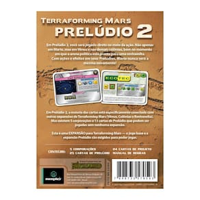 Em Terraforming Mars: Prelúdio 2, você será jogado direto no meio da ação. Não apenas em Marte, mas em Vênus e nas demais colônias, bem no momento em que a arena política está pronta para uma reviravolta. Com ações e efeitos em seus Prelúdios, Marte nunca será a mesma novamente!