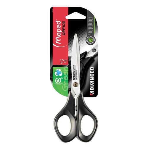 Tesoura 17cm Maped Office Advanced- Tamanho: 17cm- Material: Aço inoxidável- Formato ergonômico- Anéis feitos com plástico 70% recicladoTesoura com lâminas de aço inoxidável, e anéis feitos com plástico 70% reciclado. Possui design moderno e ergonômico, e é ideal para uso doméstico ou em escritórios.