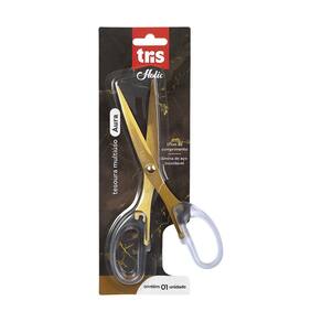A tesoura multiuso Aura possui cabo em plástico transparente e corpo metálico com acabamento dourado, trazendo elegância e sofisticação.