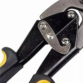 Mecanismo de alavanca dupla permite alcançar forca de corte máxima ao aplicar esforço mínimo. Dureza das bordas da lamina e 56 HRc. Entalhos especiais nas bordas da lamina impedem deslizamento de material em processamento. Tem injeção dupla anatômica confortável. Usada para cortar chapa de metal.