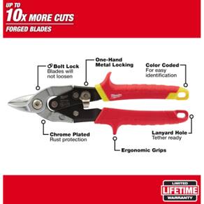 As tesouras de aviação Milwaukee são construídas para longa vida útil e durabilidade. Lâminas forjadas oferecem até 10X mais cortes do que lâminas fundidas. A lógica do parafuso garante que as lâminas não afrouxem e o revestimento cromado fornece proteção contra ferrugem. O parafuso de pivô nivelado não trava no material para facilitar o uso. A trava de metal protege a ferramenta para armazenamento e é facilmente operada com uma mão. A versão bulldog é ideal para cortes difíceis. Características:- Lâminas serrilhadas forjadas. - Trava de parafuso. - Cromado. - Parafuso de pivô nivelado. - Fechadura de metal com uma mão. - Punhos ergonômicos. - Buraco de corda. - Até aço inoxidável de calibre 22, aço laminado a frio de calibre 18.
