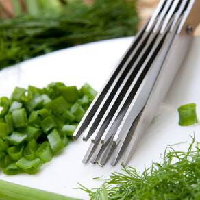 Facilita o Preparo: Esta tesoura simplifica sua vida na cozinha ao cortar vários pedaços de temperos e vegetais simultaneamente, mantendo sempre o mesmo padrão e tamanho.