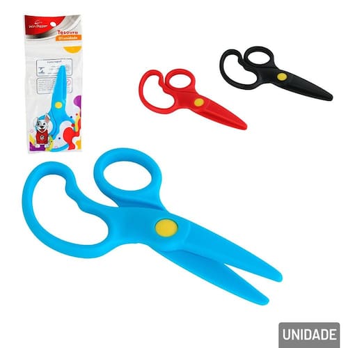Tesoura de Plástico 12cm Escolar Infantil Co Tesoura escolar sem ponta de plástico, seguro para crianças com cabo anatômico;